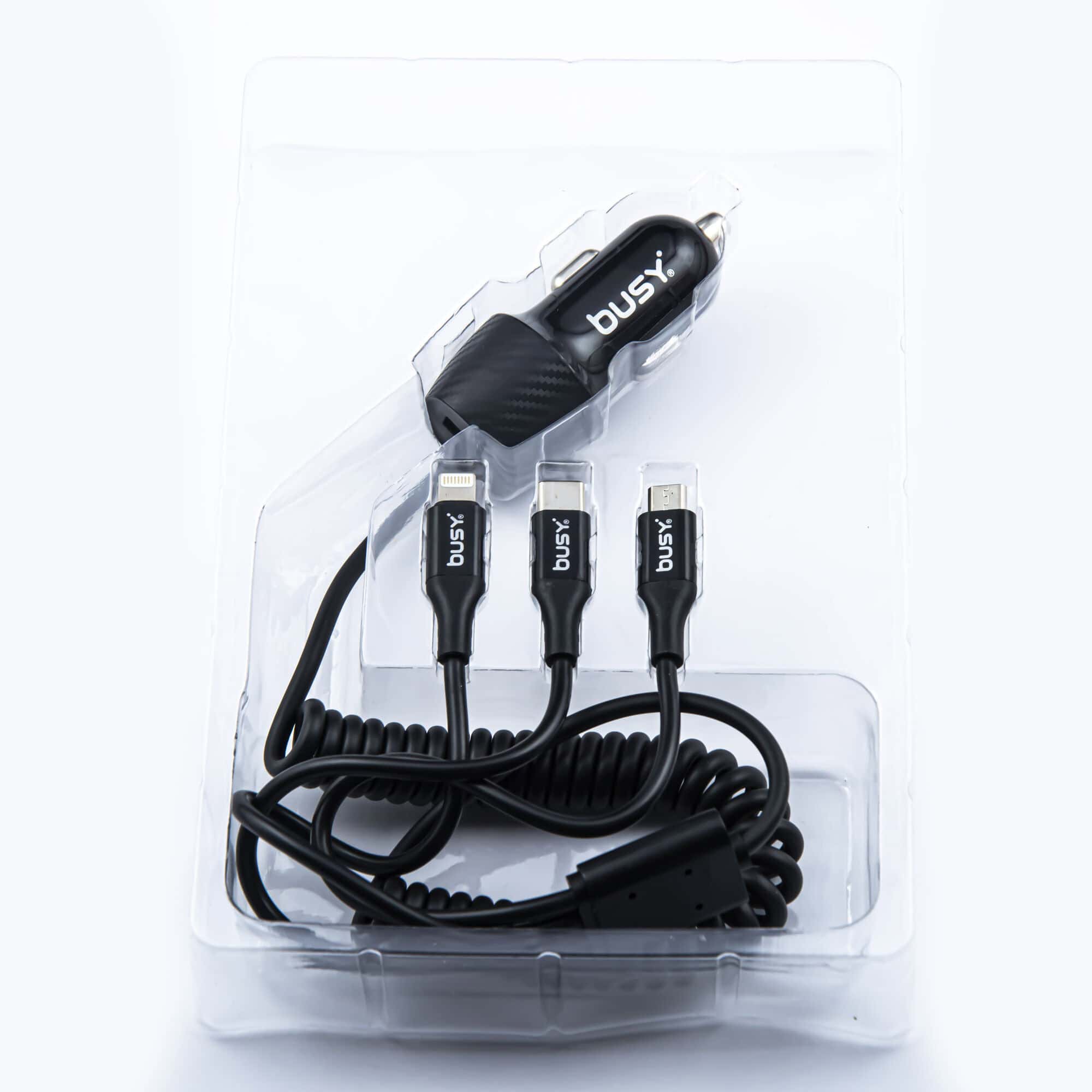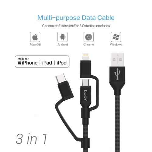 Busy® 3in1 Fast Charge Sync USB Cable 050690 е практично решение за сите уреди. Со три различни конектора (Type-C, Lightning и Micro USB), овој кабел овозможува брзо полнење и синхронизација на податоци без потреба од повеќе кабли.