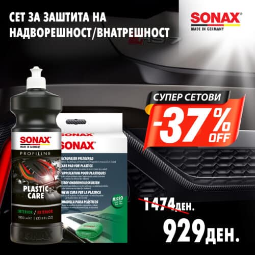 SONAX Сет за заштита на надворешна пластика – 100700 е професионален производ од германскиот бренд SONAX, создаден за нега и заштита на сите надворешни пластични површини на автомобилот. Со текот на времето, пластичните делови како браници, лајсни и ретровизори избледуваат и ја губат својата боја поради изложеност на сонце, дожд и нечистотии.
